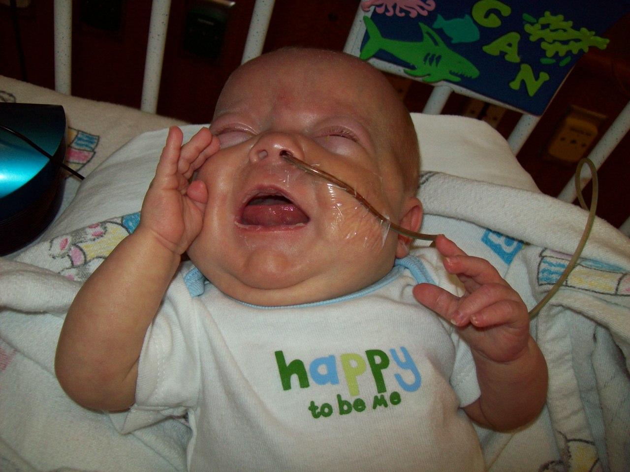 Logan is cranky - not eating for a day'll do that to a fellow. His one comfort in life right now is his pacifier. If it falls out (which it does for many reasons) he goes ballistic. His swing was enough at first, then the hunger got to the point that it was causing him physical discomfort.